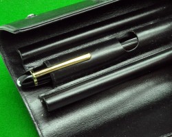 Mont Blanc Meisterstuck Le Grande 147 Traveller in Black and Gold fill trim. In absolute MINT Unused condition in Original Black Leather case with cartridges. Cartridge or converter fill. Fitted with the original twin tone 18kt gold medium tipped super smooth nib. c2005 £315
