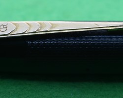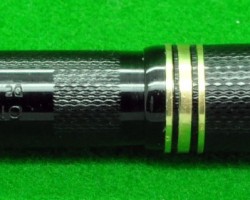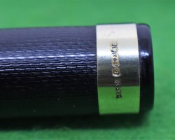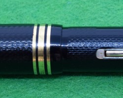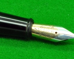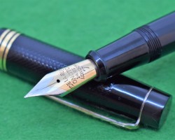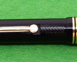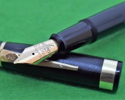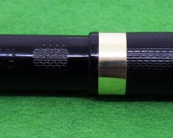 Onoto Magna 1703 in Chased Black with gold fill trim. Stunning Pen in ABSOLUTE MINT condition. Lever fill . Fitted with the original twin tone, huge size 7, 14kt gold super smooth medium tipped nib. c1946 £780